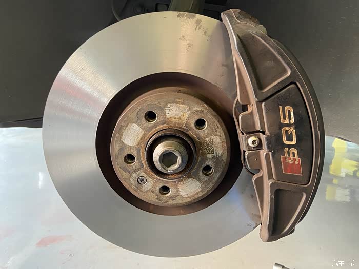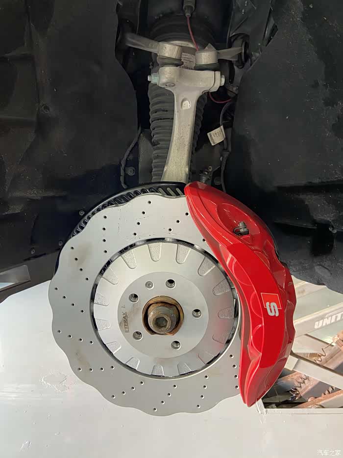 旁边有辆S7在更换梅花打孔盘,这红色大鲍鱼配梅花盘,看着不错。再过两年也打算更换成划线打孔刹车盘。