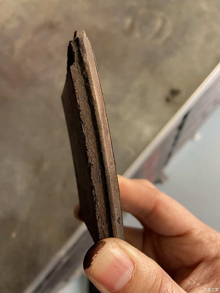 对比一下厚度的差异,4.2万公里基本被磨掉了一半多一点的样子;刹车片极限是剩余3mm必须更换,预计原车的后刹车片6万公里左右是要更换的。