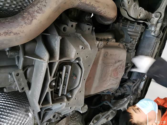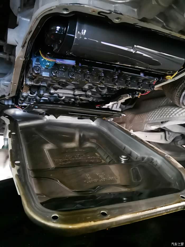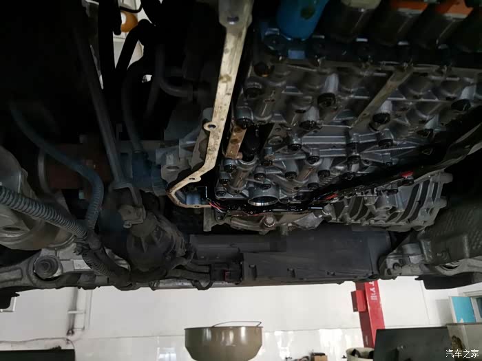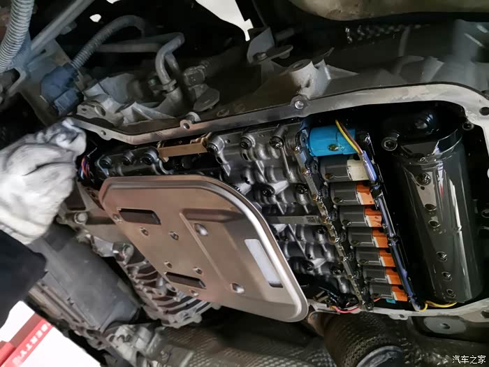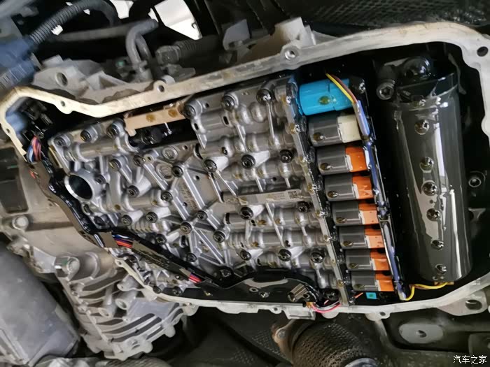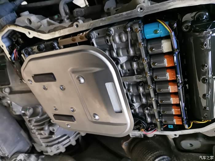 油底壳打开了,漏出来复杂的油道,电磁阀,还有滤芯。