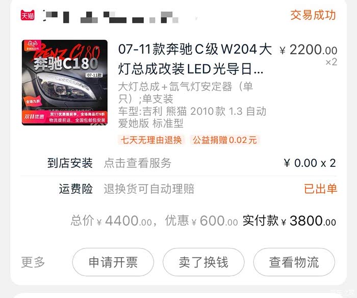 一对大灯3800大洋,买回来之后发现灯光很暗,光是看外观是很漂亮,但是灯壳质量跟透镜质量都太low,于是又改了大灯,这次改的是Led的,因为氙气灯说不是主流了……