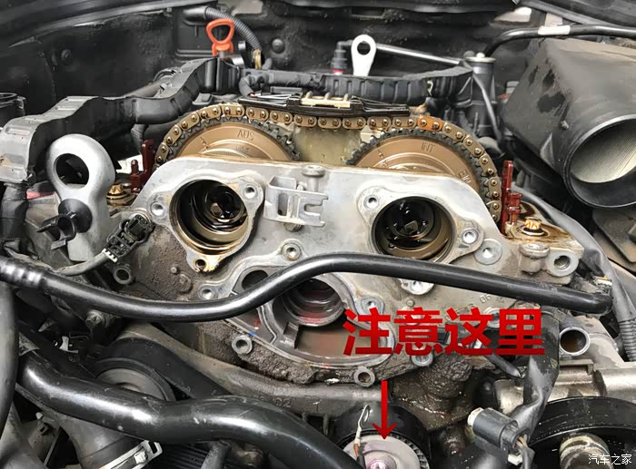 拆掉端盖板后,才进入我们的正题,拆装更换进气侧凸轮轴齿。
