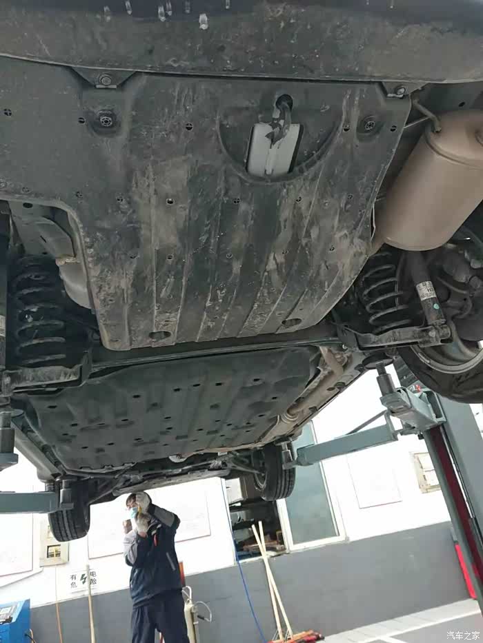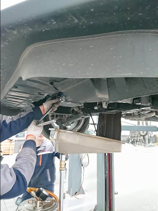 在保养之前先签几张单子,这些工作人员都会介绍。然后就可以用顶升机把车子升起来,工作人员会测量胎压补气,然后拆掉护板。露出放油螺丝和机滤。放出原来的旧机油,拆下旧机滤。