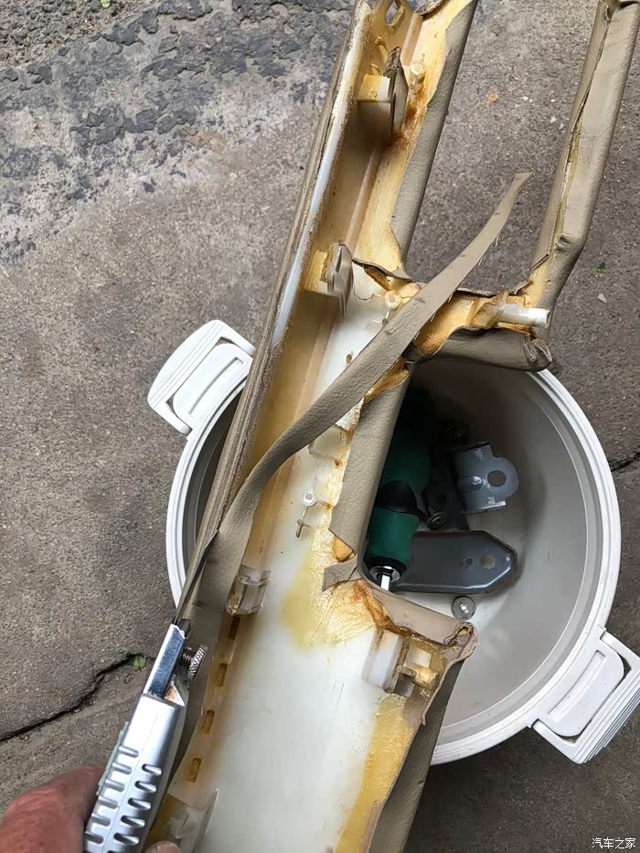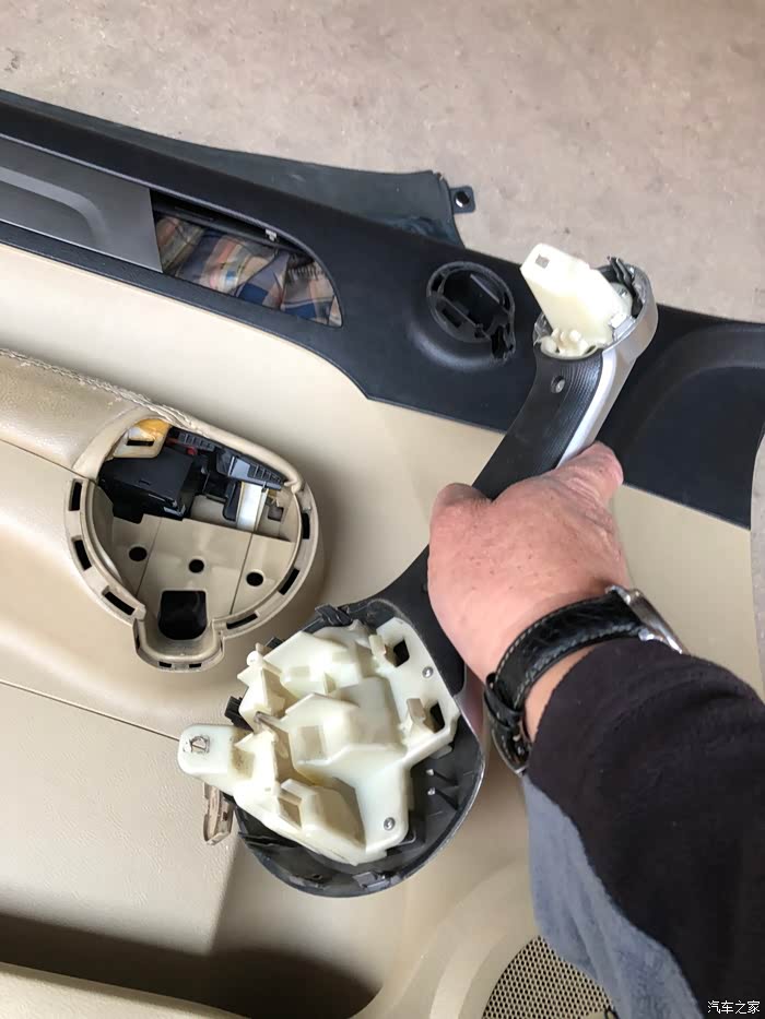 用力往外拉下门把手,如果对这个不做翻新就放一边,拆下5颗小螺丝,把俩头白色中间黑色部分拿下来方便喷漆。