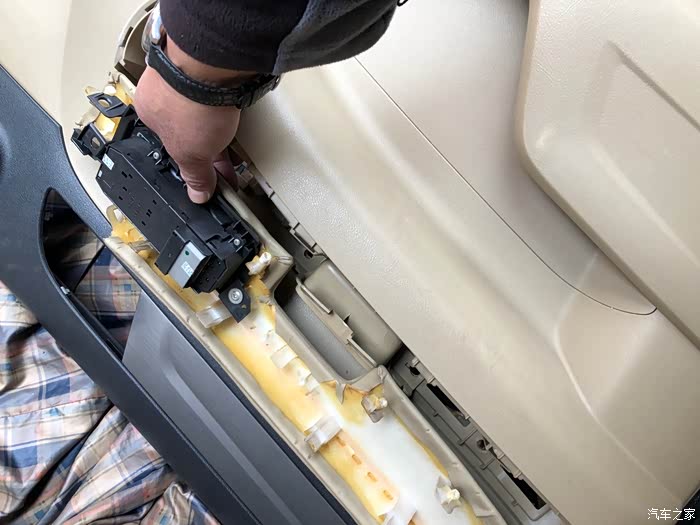 拆下这个玻璃升降开关总成插头,门皮就可以拿下来了。