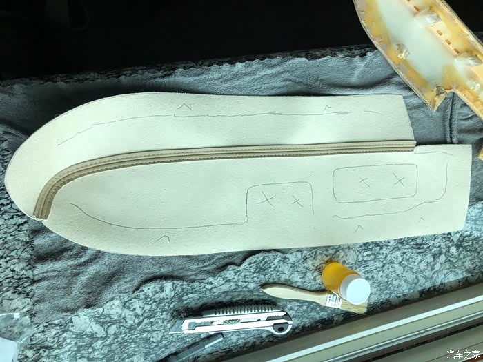 刷完胶等十几分钟就可以蒙皮了,蒙皮的重点是以缝线部分为中心对位点,尽量把皮子拉紧,蒙完皮要对多余的边进行修剪,特别是靠近螺丝孔的地方不能太厚