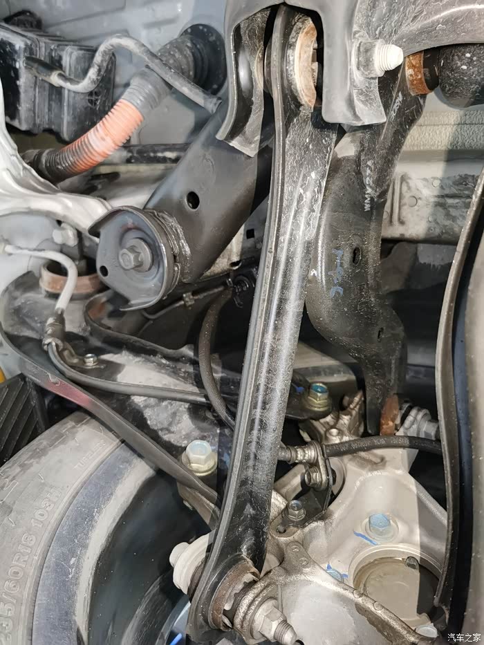 再来看很多人提到的后悬挂上的几个摆臂衬套上的锈蚀,单边悬挂上一共有5个会锈的衬套