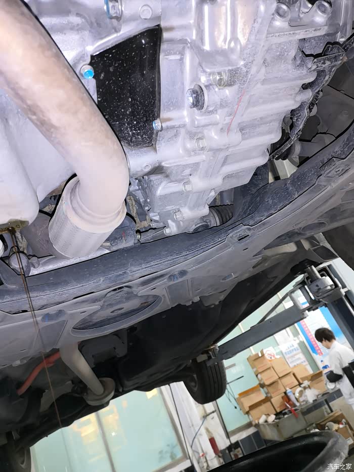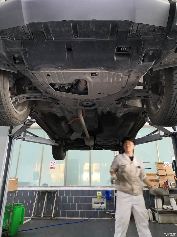 首先,工作人员将车子升起来,拆机滤,放旧油。同时检查底盘。自己也顺便检查一下底盘。