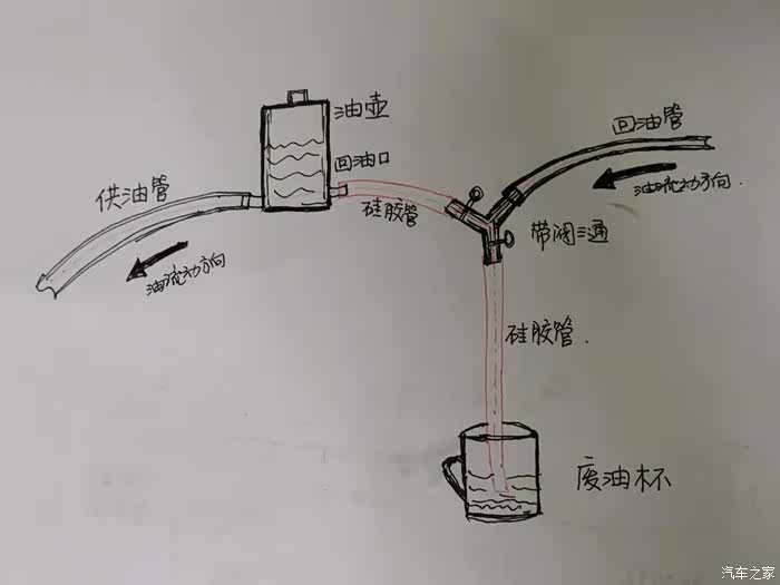 接着,拆开回油管,接上三通(带2个阀门的三通),因为一个人操作,空间又很小,拍照不会很直观,所以画一张示意图给大家。见下图!三通的另外一端接废油收集瓶。