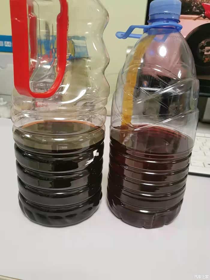 下图2个瓶子,左边一个瓶子装的是刚开始排放的纯旧油,右边一个瓶子装的是加入新油后,油路进行循环冲洗放出来的新旧混合油。