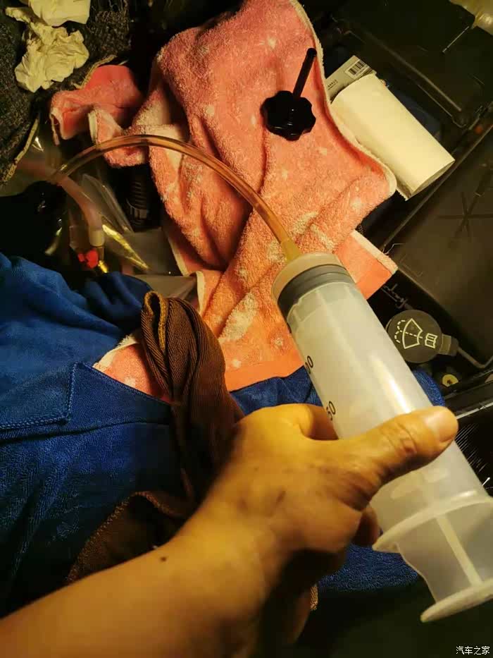 这里要说明一下:其实先抽干油壶里的旧油,再去接回油管的三通阀门也可以的,当时是担心油壶里的油如果先抽掉,再去拆卸回油管,万一安装硅胶管时不顺手,没那么快,那么油壶里剩下不多的油会漏干,使油壶另外一端出油管进空气了。