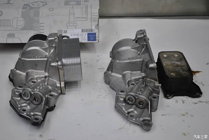 更换的机油座总成连带机油散热器一起的,奔驰原厂配件,4S质保两年,同样的配件外面竟然质保两年半,价格还便宜