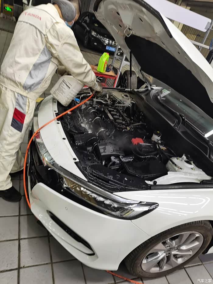 妹子背影离开我的视线,一回头此时发现帅哥已经给我清洗发动机了,其实我不想清洗机舱,这种做法纯忽悠人,弄个喷壶用最少的水把浮灰吹下去,就问一句,这浮灰吹哪去了?那瓶绿桶就是我的机油,还剩下1升,帅哥说机油加3升。