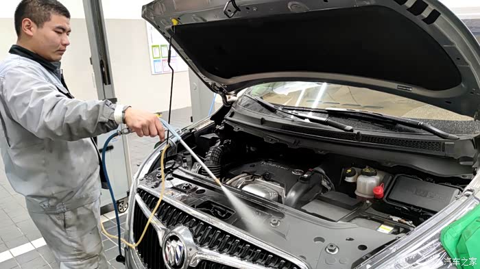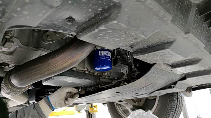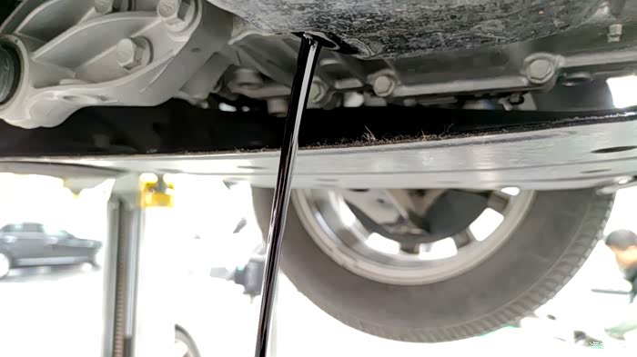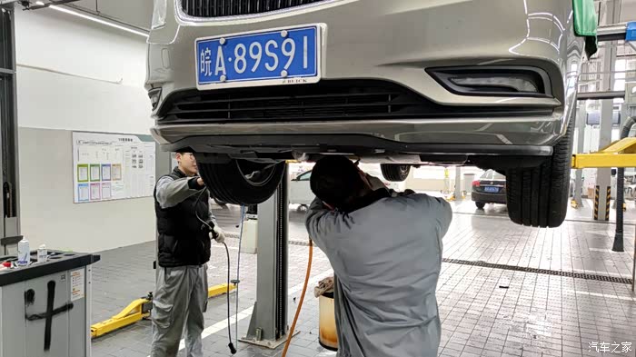 维修师傅再次把车顶起来看看机滤是否渗漏。