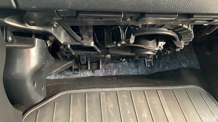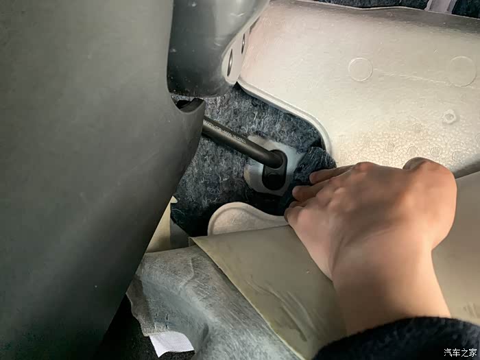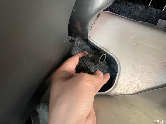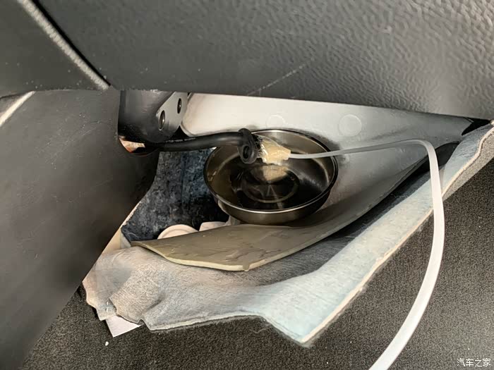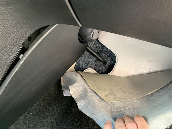 6.毛巾垫好后从副驾上脚底前端揭开原车地毯,就能看到一根黑色的管子,就是空调排水口