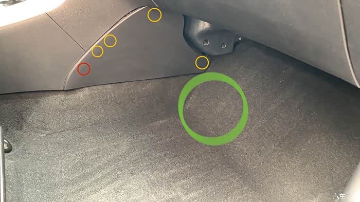 4.接下来拆开副驾驶左侧的挡板,4个黄色的位置是卡扣,敲棒轻松撬开,红圈位置有螺丝,不需要完全拆掉此挡板,只需要掰开一点挡板就能操作。掰开这个挡板是为了能揭开副驾驶的地毯,绿色大圈就是空调排水口的位