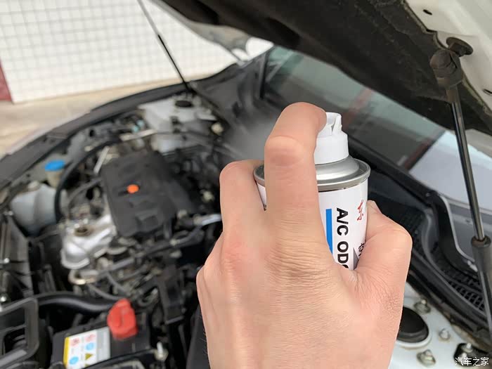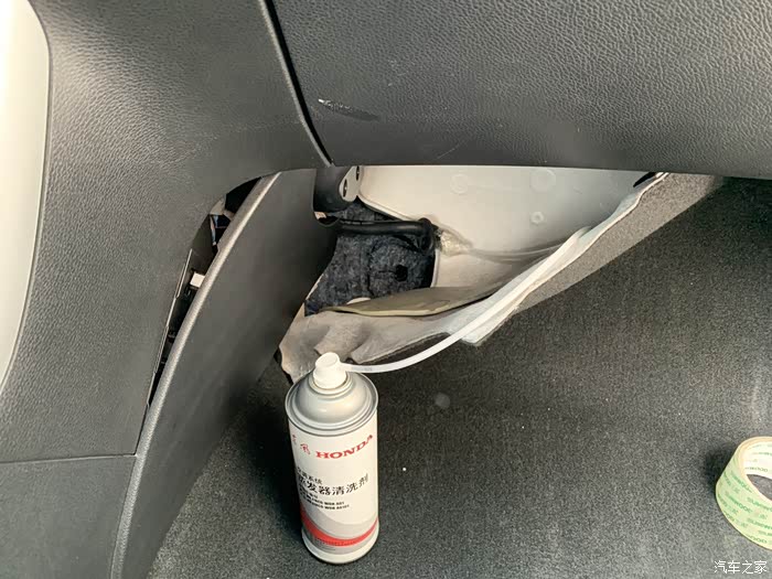 10.注入蒸发箱清洗剂后我用了个小盘子接着,不然水会流到地毯上,第二次注入后可以直接吧排水口装回,这样水就直接流到车外了