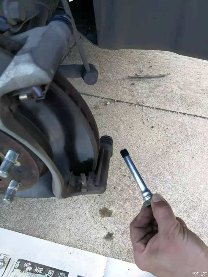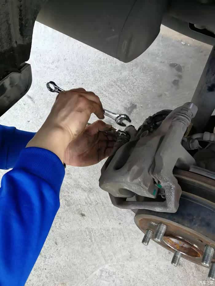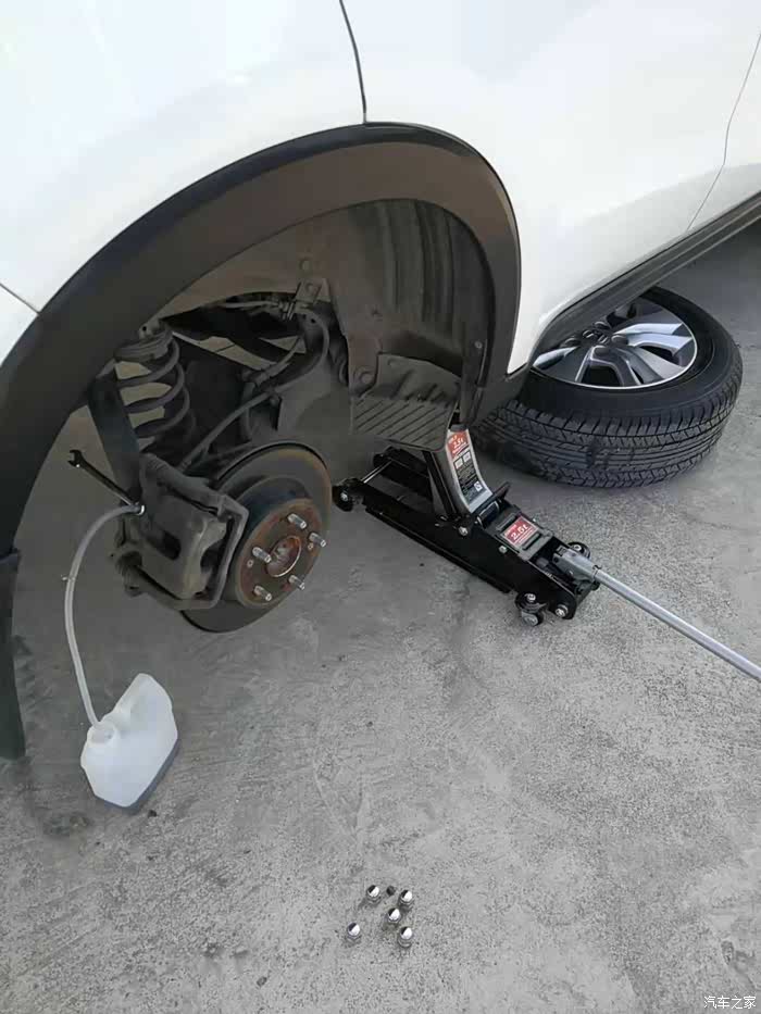 后分泵放油螺丝是11MM,紧固力矩是11牛米。千斤顶举升车辆,注意用拆除的轮胎放在车身下面做好预防措施