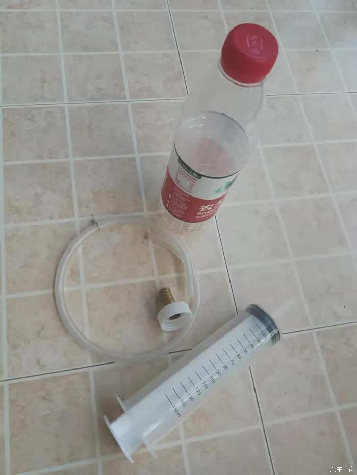 瓶口自己加装了一小截宝塔接头,用矿泉水瓶做的自动补液器,这样不用担心刹车油壶里面的刹车油缺少导致刹车系统进空气