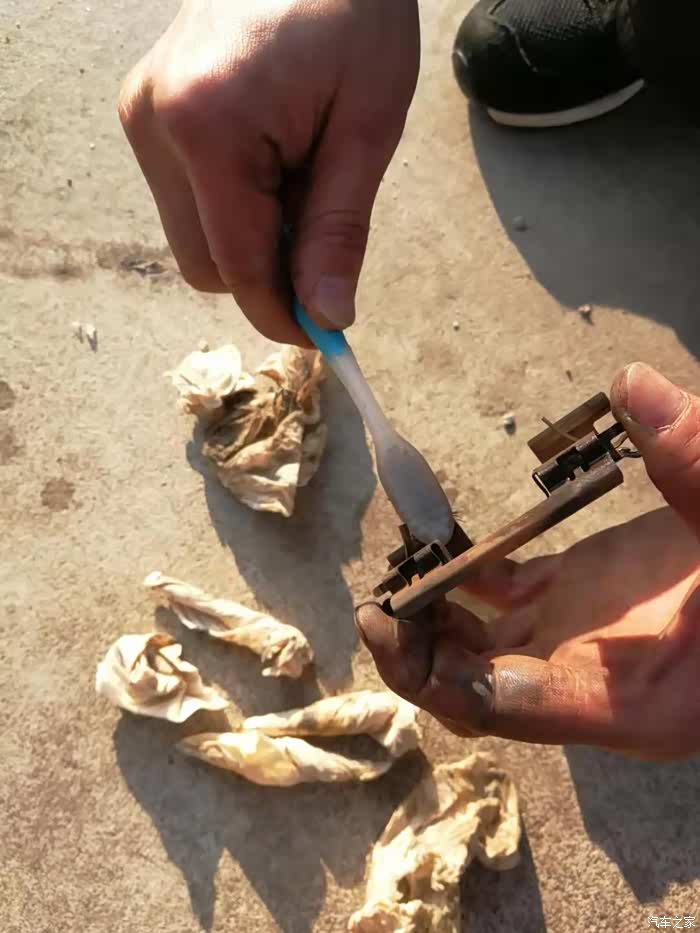 刹车片拆除后可以用牙刷清理刹车片上面的铁屑,注意刹车片的位置,内外刹车片的结构是不一样的,有指示警告铁片是内侧的刹车片,刹车片清洁不要沾上油污,否则会导致刹车失灵