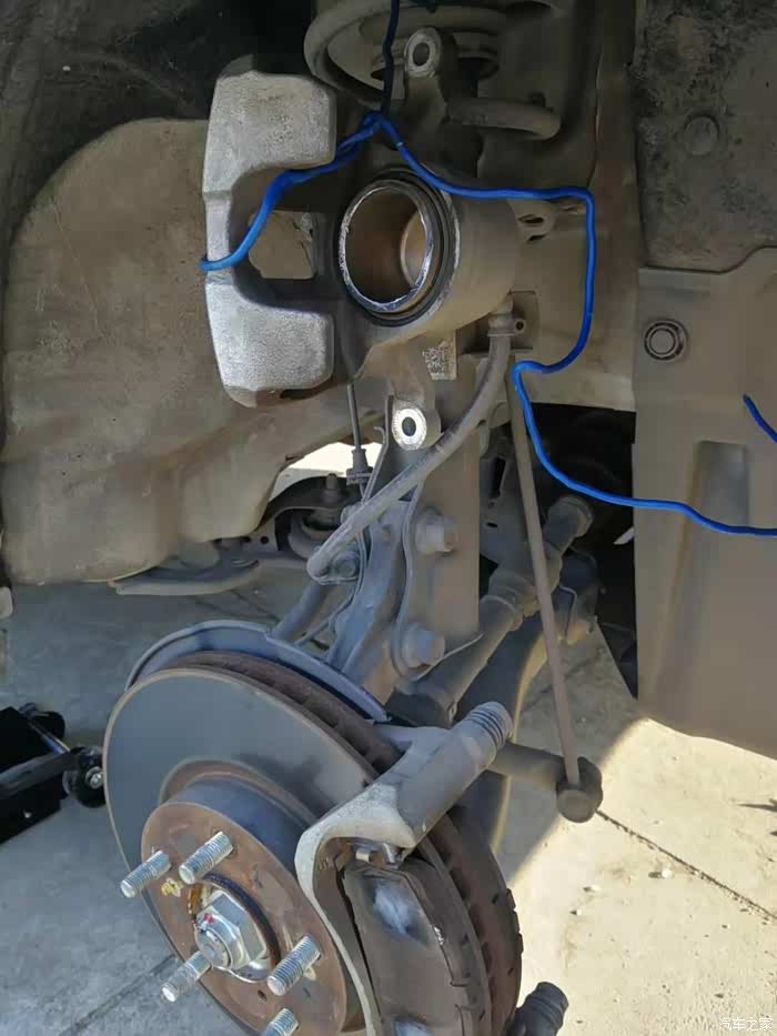 导向销2颗螺丝拆除后,用铁丝将分泵进行悬挂,注意不要损伤刹车橡胶油管