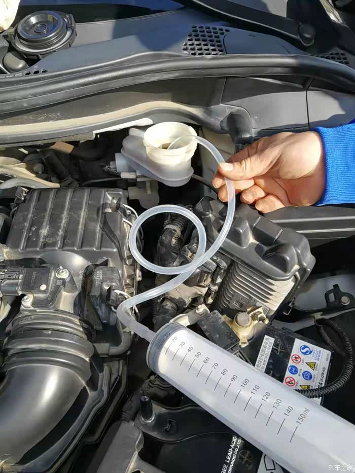 更换刹车油首先需要用注射器将刹车油壶里的旧油抽出来,这里需要注意的是刹车油壶里面的滤网要取出再抽,否则将抽取不到旧油
