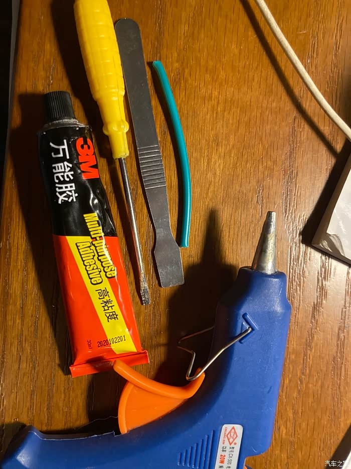热熔胶枪,撬棒,小平口螺丝刀,废旧电线,强力胶水。还有个镊子照掉了。