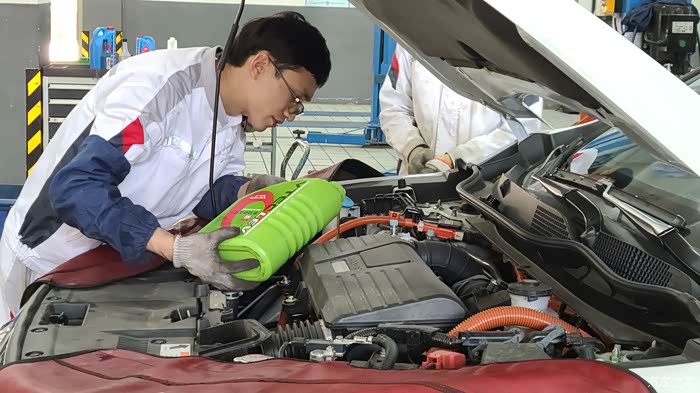 看他们技术还是挺到位的,各种各样的操作非常的规范,小老哥倒机油的时候一点点都没有晃出来,特别的干净利落做事情。