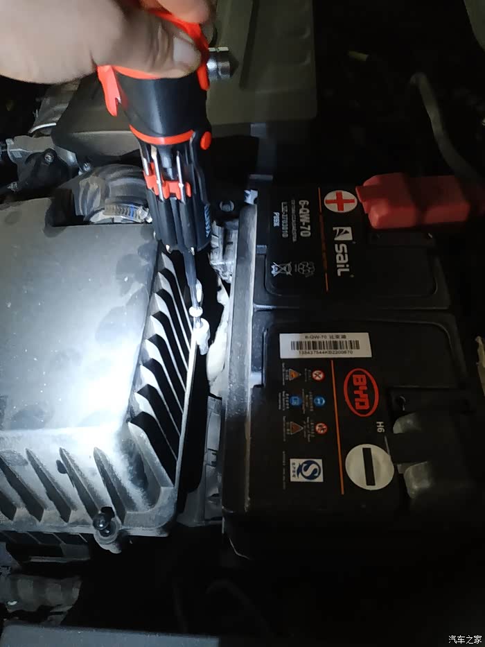 上一辆帝豪空滤是卡扣型的,秒换。这宋婆娘空滤比帝豪的大两倍多,变螺丝了,五颗螺丝。达人们,须准备螺丝刀哦!