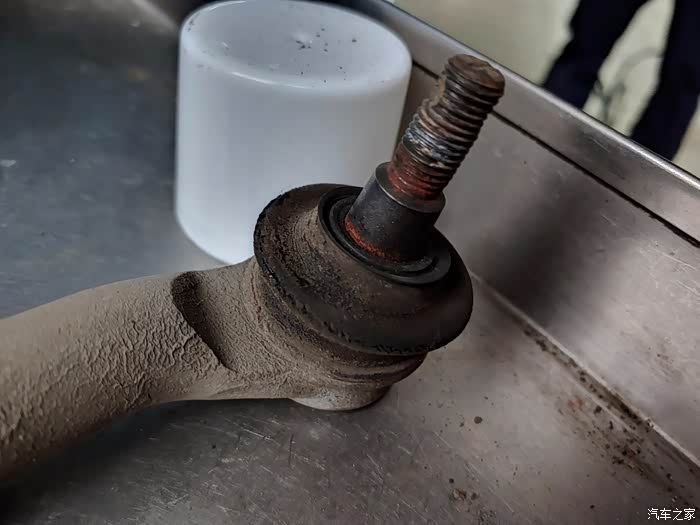 准备拆卸外球头。这个要上锤子敲几下才能下来。其实原则上按规程应该使用专用工具给它顶下来。但是国内4S也几乎都是图方便,敲几下。