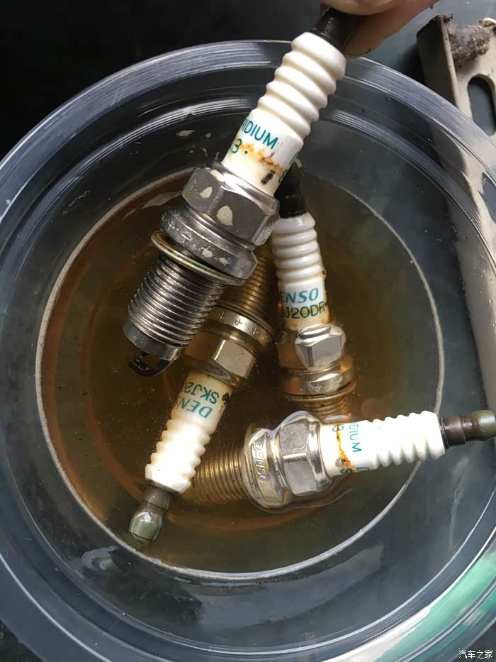 旧火花塞,拿去泡,清洗的液体,可以拿家里常见的,食用白醋,84消毒水,洗厕精,酒精。这些都是可以清洗的。就这样泡着,过段时间再来看看。