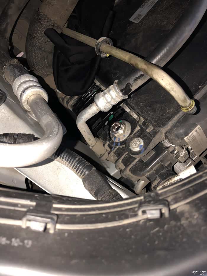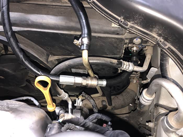 把变速箱油管和散热器连接处拔掉,有螺丝需要拆,这是拆完的,那个孔里面是散热器,上面的管子是变速箱油管,这样后就可以接循环机了。
