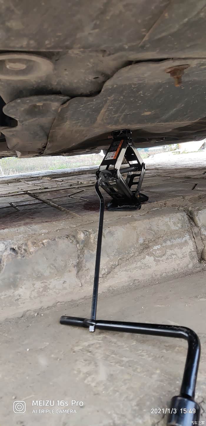 先找个有高差的位置打千斤顶,这是路边人行道上,条件有限,懒得到处找高差大的位置。直接打在钢质护板上,完成后虽然有点凹,和油底壳还有间隙,下次上举升机在敲回来。