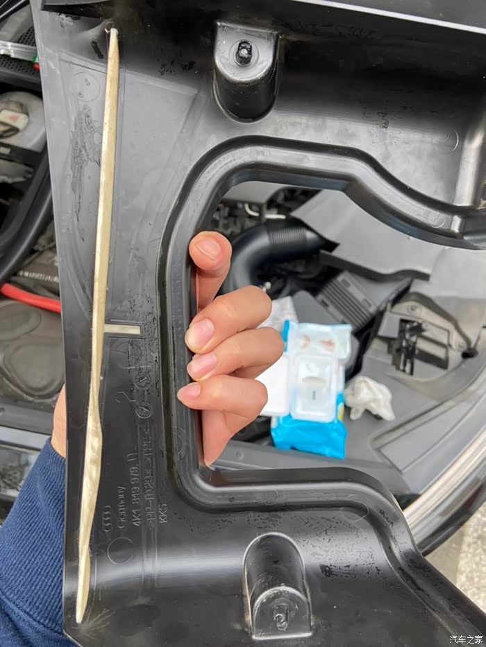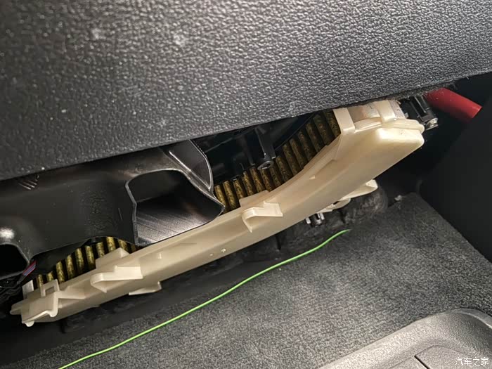 首先是内置空调滤芯,这个网上的教程最多,首先拆下副驾驶手套箱底部的灰色海绵垫,注意拆的时候有两个黑色纽扣,直接抠出来就行,无需其他工具。接着将白色(A6allroad为白色,A6L可能是其他颜色)弯曲的滤芯盖抠下来,有几个卡扣,一定都扣开再往下拆,别太粗鲁,拆下来的时候动作慢一点儿,挺脏的。接着就是取出脏的内置空调滤芯并更换,注意安装的正反方向(黄色朝里,白色朝外),别装反了。