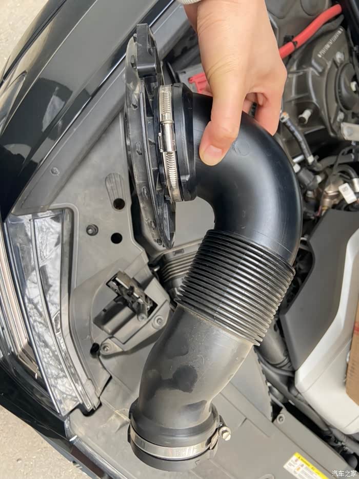 拆下进气管后将就空气滤芯取出并更换,小口向下,大口朝上