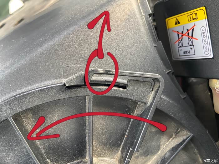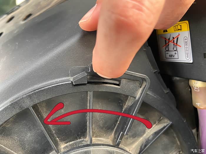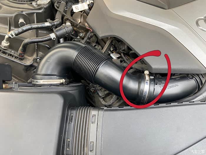 下一步是更换空气滤芯,这一步需要一字改锥,打开发动机盖后拧松图中的螺丝,接着抬起图中所示卡扣,逆时针转动,然后轻轻晃动,然后将进气管拆下来。