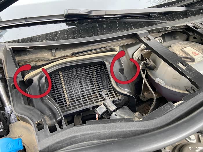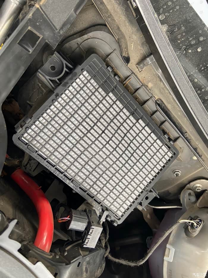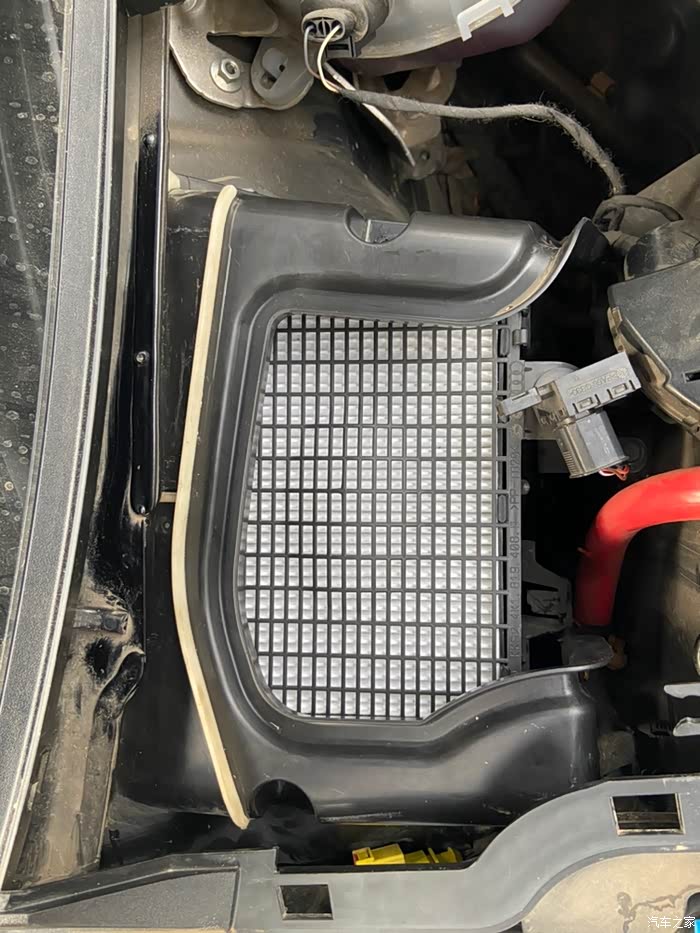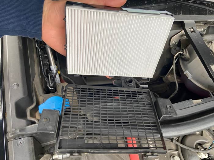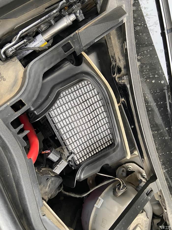 最后更换外置空调滤芯,这玩意儿原厂是都没有的吗?需要用到内六角梅花扳手(一字改锥不知道能不能凑和),T30,首先拆下发动机左上角的挡板,往上推再抬起来即可,然后拧松两个螺丝,取下外置空滤的挡板,这一步需要点儿狠劲儿,要不可能拆不下来,反正拆不坏就对了,接下来打开外置空调滤芯保护网,将滤芯如图安装,扣回即可。