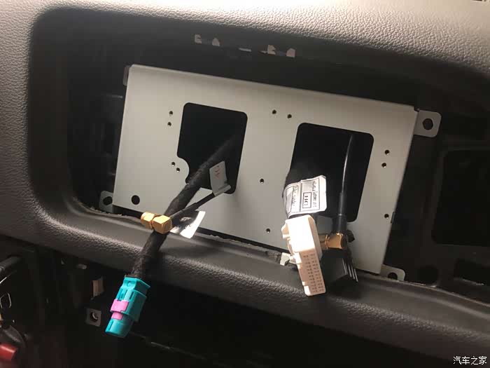 用之前的拆下原厂屏幕的4颗螺丝固定好新车机的金属支架。最左蓝色头的是转接出来的新车机的视频线,两个金色头的是GPS和4G天线,注意别搞混了,白色大插头是新车机的数据线,最右边的黑色头是双闪线。