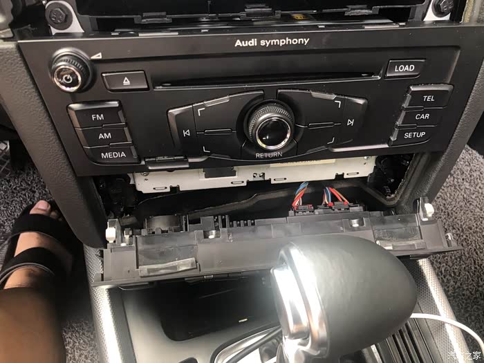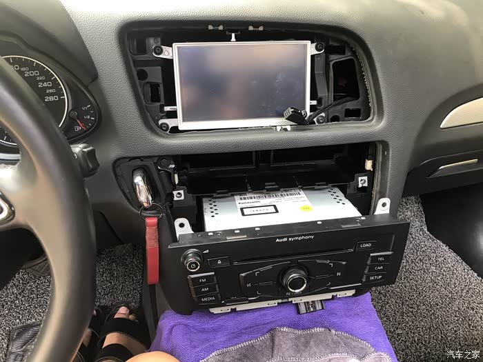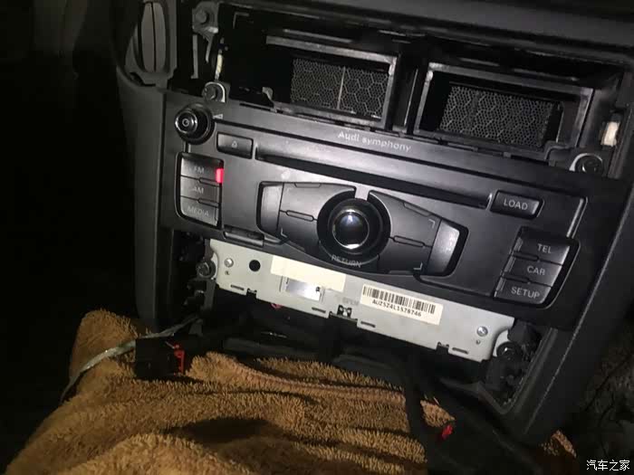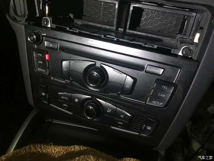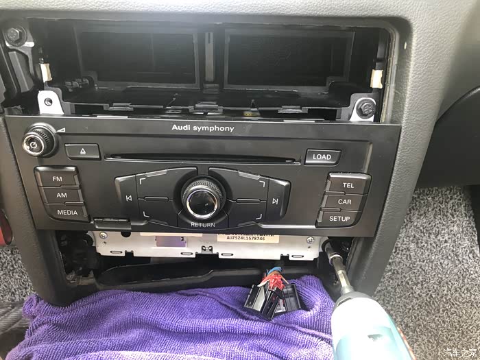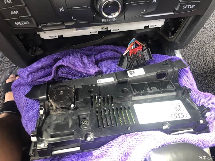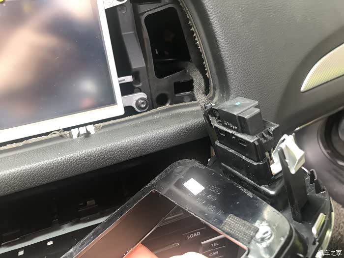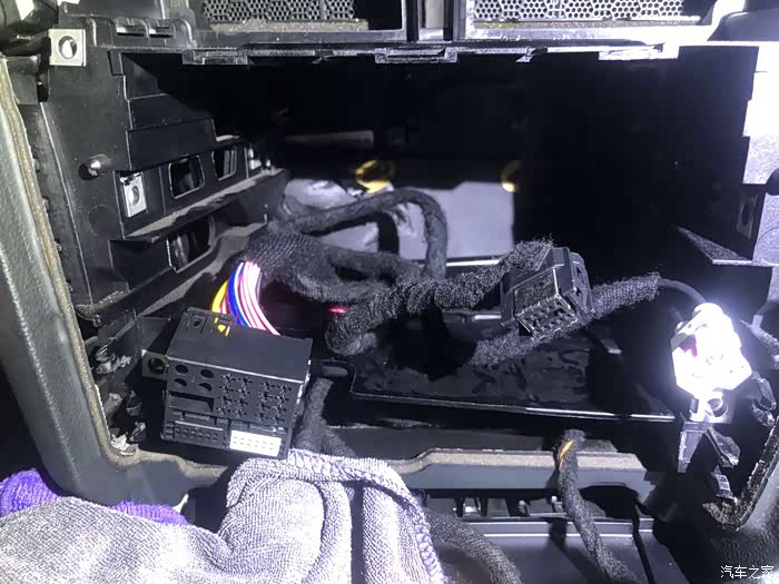 多媒体CD机接口对接,插好。空调面板接口对接查好。这里要记得档位最好打到N,否则CD机无法放置,记得垫毛巾,防止刮花,一定要理清里面的线束,否则CD机后面会卡住,导致无法安装回位,小技巧大插头安放到下层的空调面板后面的位置,先尽量往边上固定。别问我怎么知道的