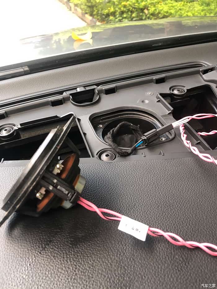 螺丝取下就可以把中置喇叭取出了,后面要接车机的中置喇叭混音线。一会把新车机的GPS和4G天线安排在这两边的洞里。