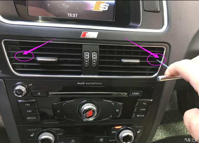 先拆中间空调出风口面板,借用老杨的图,用2个钩子勾在这个位置的小孔里面,两边同时往外啦,就出来了,没有螺丝。
