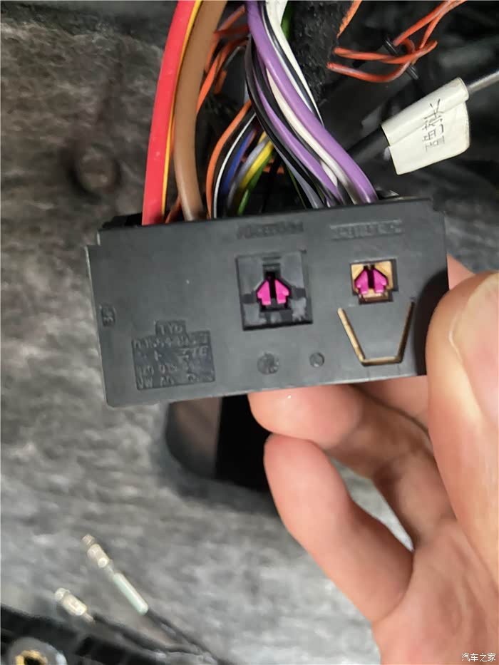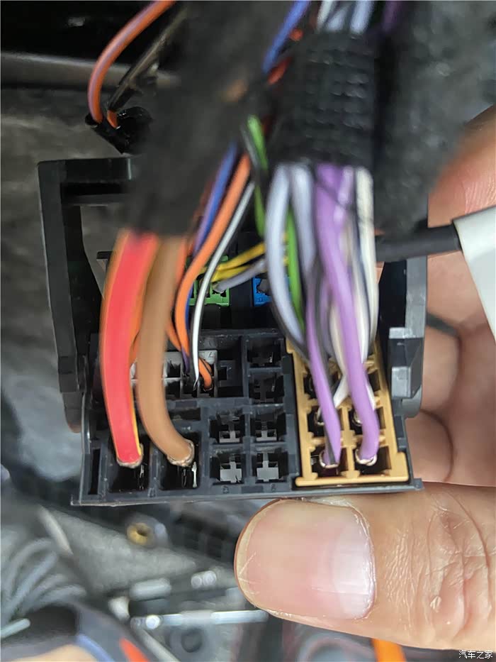 这个对应上图是并接中音的接线方式:我采取的屙屎从原车CD主机后面直接并线的方式