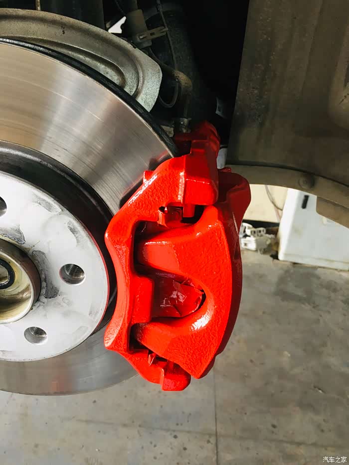 接下来就是轮毂和刹车做了烤漆,黑红配。这是前轮的