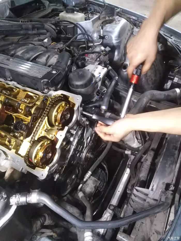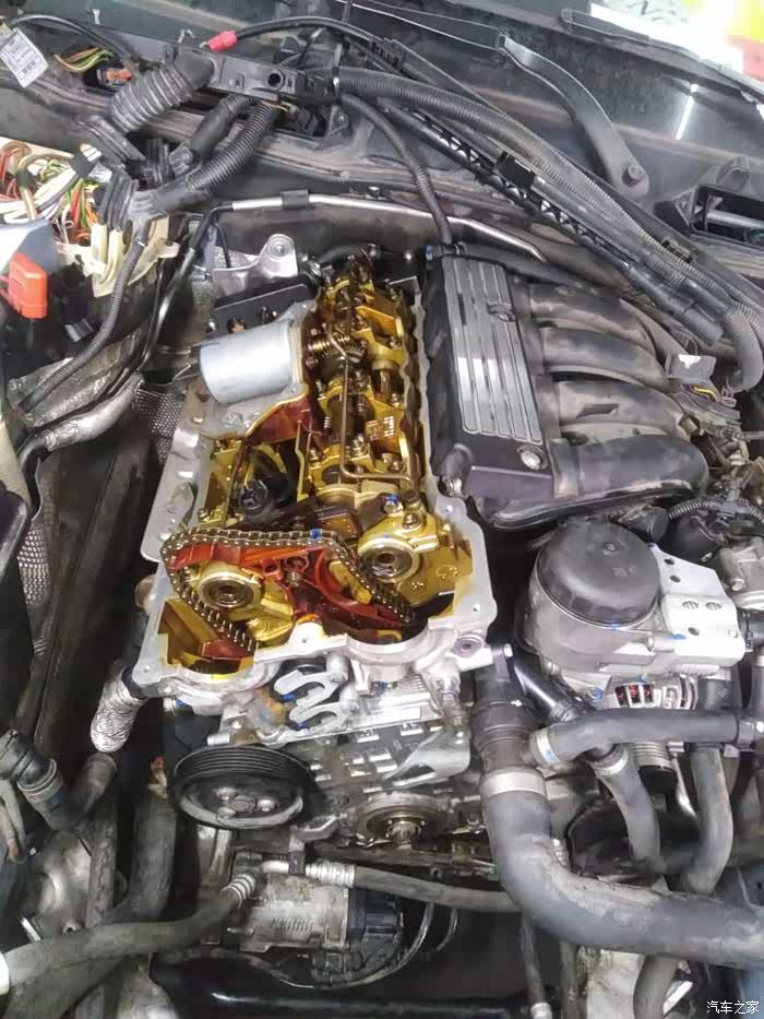 车友一台E90行驶过程中仪表提示发电量故障,由于发电机故障导致车辆行驶过程中抛锚,车辆救援到店、经过检查发现发电机轴损坏导致,车辆在检修的过程中发现如下问题,引擎漏油严重,前减震损坏,在处理漏油的过程中发现引擎的正时连扳断裂