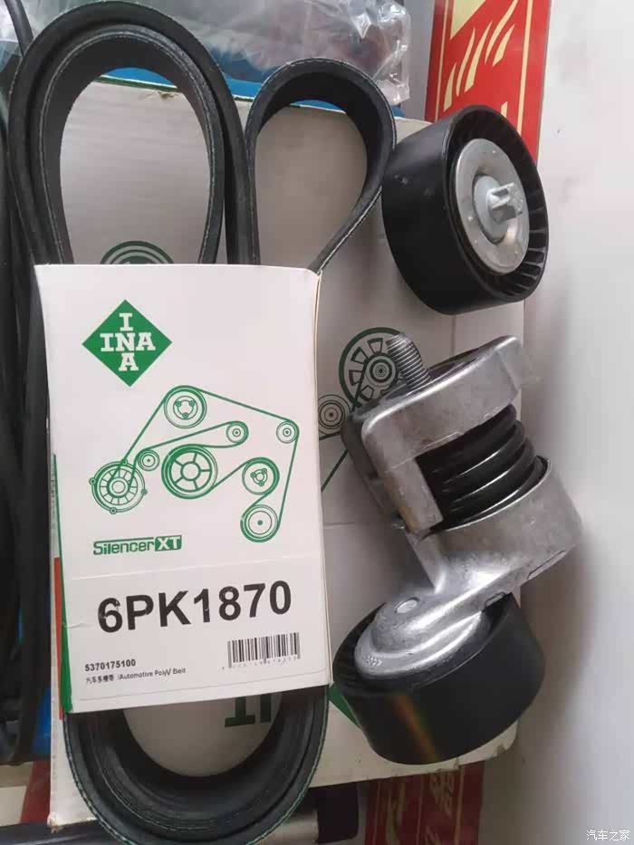 幸好小伙伴细心及时发现了隐患,避免了后期引擎因为正时导轨出现彻底断裂导致引擎损坏。维修发电机故障时发现发电机驱动皮带张紧器及导轮出现异响,考虑到行驶里程较长以及出现异响果断建议更换全新套件(建议10万公里更换一次)