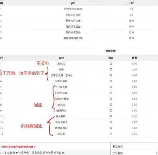 维修发电机故障时发现车辆漏油严重,需要维修。