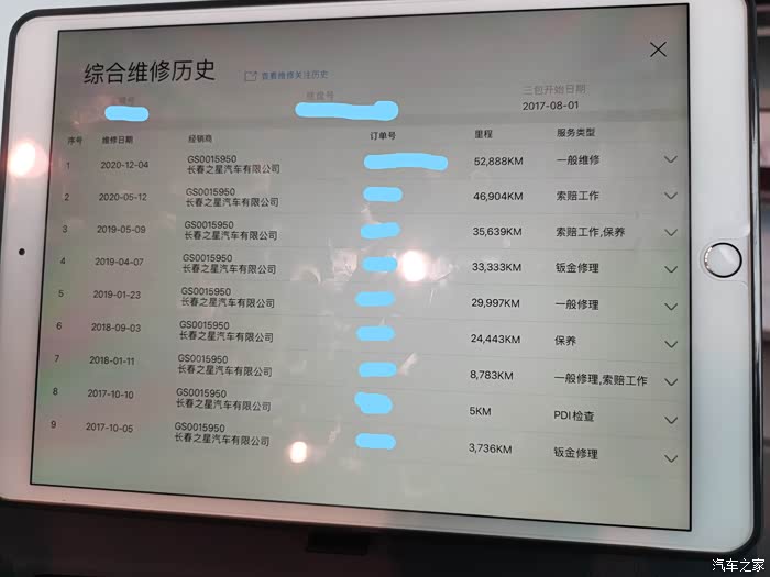 当然4s店的保养套餐也暗含了一些小套路,他会规定时间和里程来让你来店保养,如果超时或者超公里数就会给你作废一定的保养次数,就拿这台车来说,4s店虽然赠送了6次保养,但要求每次保养间隔周期不得超过1年,所以有一次超过1w5公里保养的时候就作废了一次保养次数,最后这台车只在4s店享受了5次免费保养,我向售后专员索取了保养记录,也核对了一下这台车的维修历史。