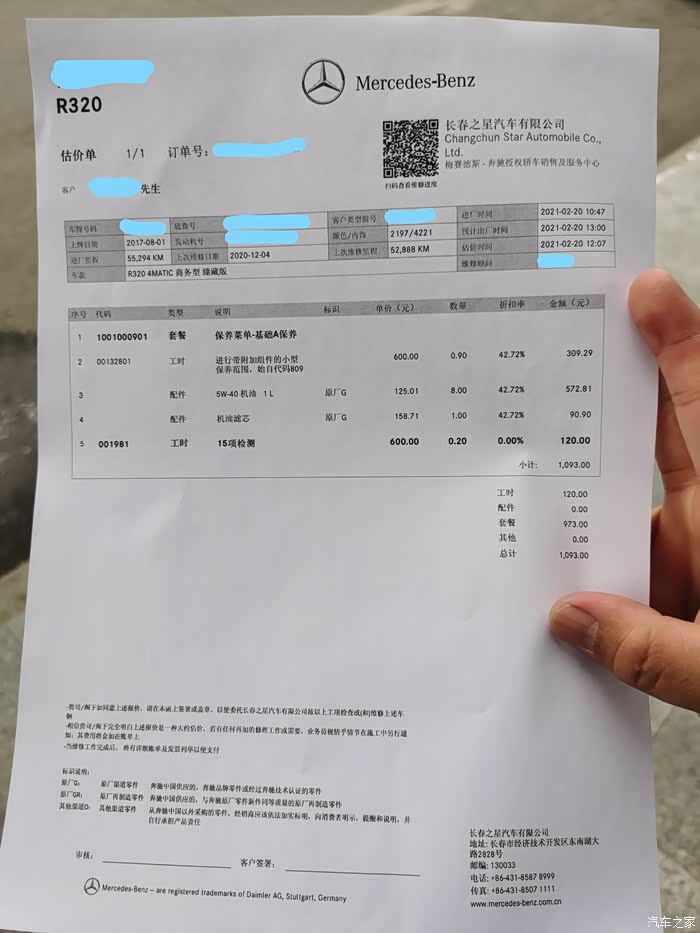 最后完成本次保养,售后专员将保养工单交给我,可以看出本次保养的费用明细很清楚的写在了上面,并且向我介绍了他们的优惠活动,现在买2次保养可以赠送一次保养服务,也就是说1次保养按照1093元计算,1093*2=2186可以享受3次保养服务,折合每次保养成本在728元,相对于奔驰这个品牌我觉得8L机油+机滤保养服务才728元的确非常划算,即使自己用水油+曼牌滤芯保养一次的费用也要达到将近500元,并且现在里程已经来到55294公里,下一次保养还要面临换变速箱油,不得不说对于变速箱油,我还是更倾向于让4s店来进行更换作业更放心一些,所以下一次保养具体是自己搞还是再来4s店,目前还在纠结中。
