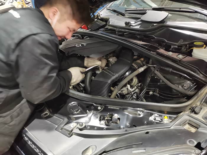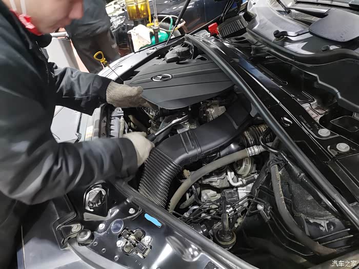 技工师傅将发动机饰板打开,机滤就暴露出来了,上机滤安装位置非常适合自己手动抽油保养操作。