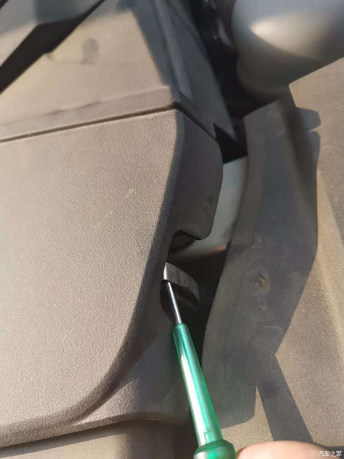 第一步先拆这个发动机盖板,两边各有一个金属小卡扣,拿个小一字螺丝刀一撬就打开了