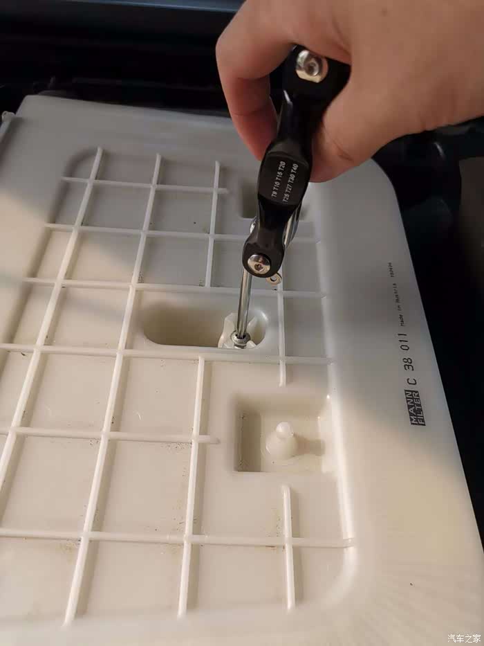 中间那坨白色的就是空气滤芯了,这个拆装简单先用个梅花螺丝刀,拧掉中间的螺丝
